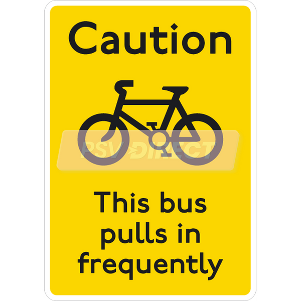 Caution This Bus Pulls In Frequently Sticker, Black Text/Bike Symbol on Yellow Background, 148 x 210mm