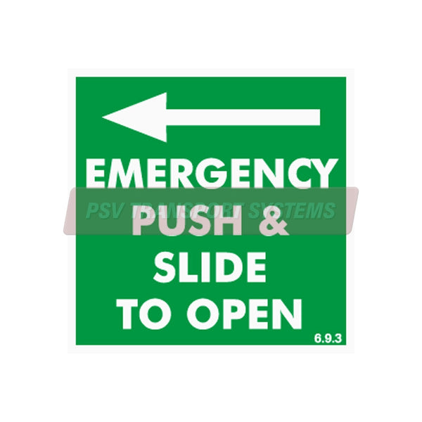 Emergency Push & Slide To Open + Left Arrow Sticker. White Text and Symbol on Green Background. 6.9.3