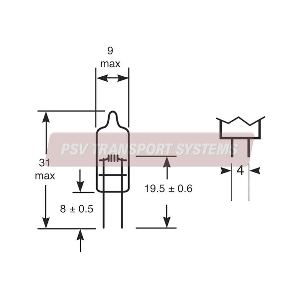 24V 20W Halogen 2 Pin G4/9X6 Bulb Related Parts Part No Voltage Wattage Type PSV/09/022 12v 20w Standard PSV/09/023 24v 20w Standard