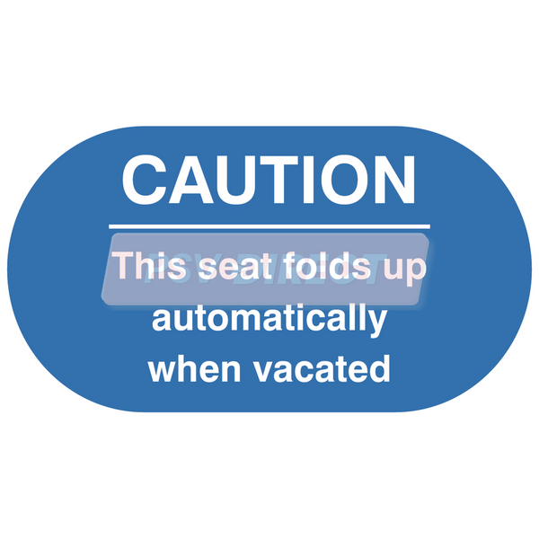 Caution This Seat Folds Up Automatically When Vacated Sticker, White Text on Blue Background 218mm x 119mm