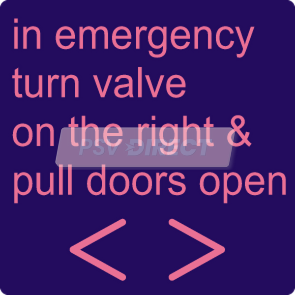 In Emergency Turn Valve On The Right & Pull Doors Open Sticker, Pink Text on Purple Background, 104 x 104mm