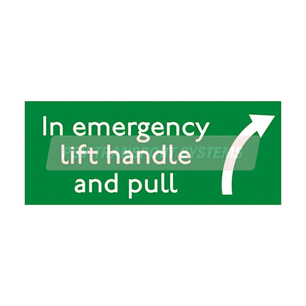 In Emergency Lift Handle and Push Label. White Text/Symbol on Green Background